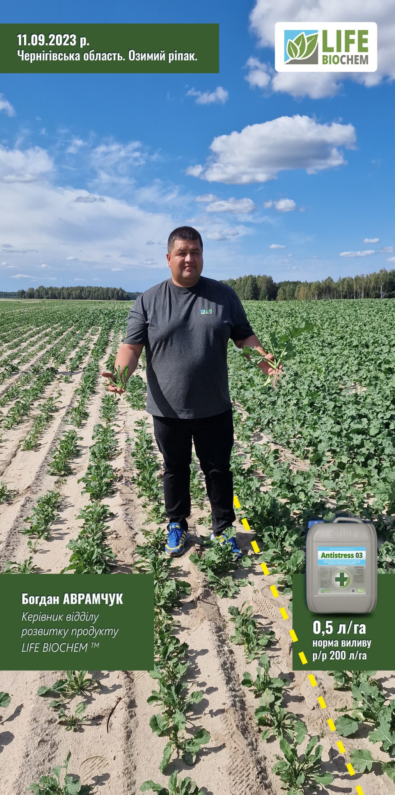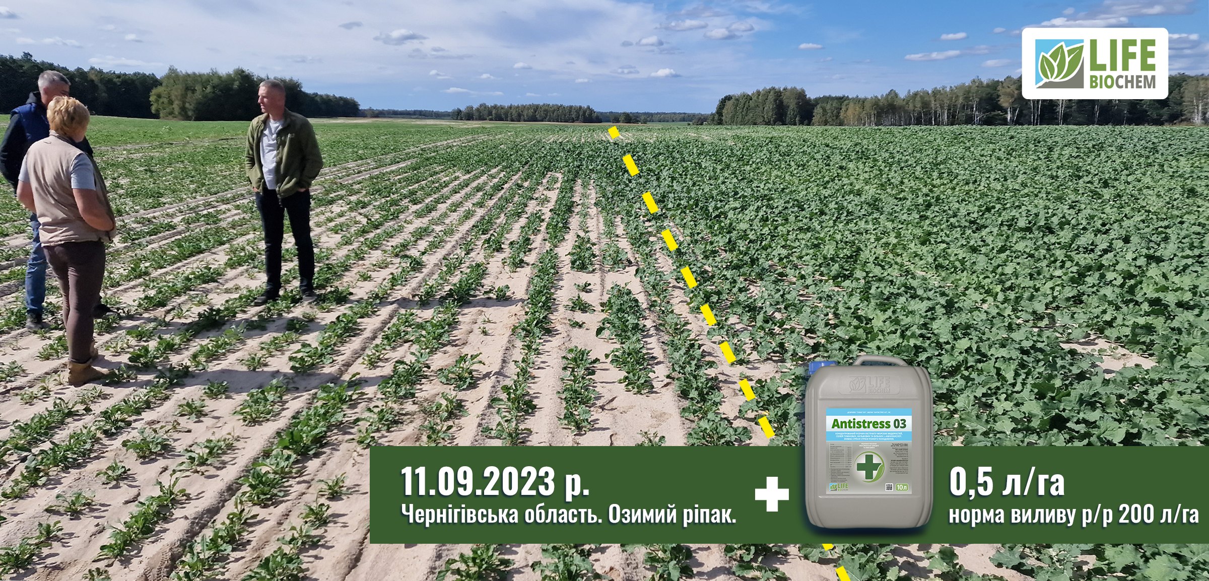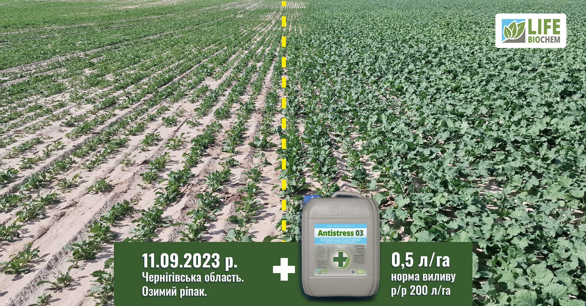 Команда “ЛАЙФ БІОХЕМ” швидко відреагували — порекомендували внести потужний антистресант препарат “Антистрес 03” в нормі 0,5 л/га з нормою виливу робочого розчину 200 л/га.